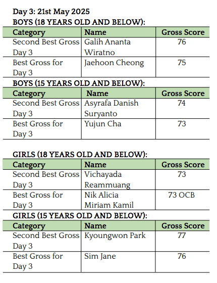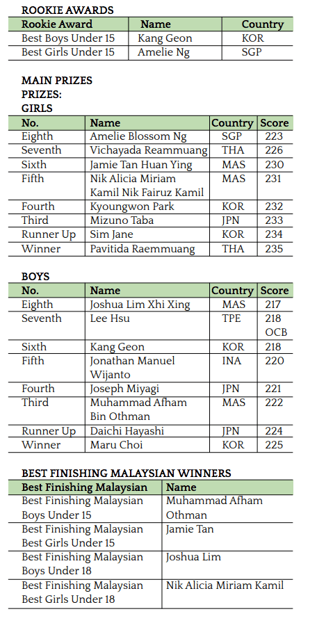 As part of a continued pathway initiative, the best finishing Malaysian boy and girl in the Under-18 category earned selection to represent Malaysia at the Singha Thailand Junior World Championship 2025. This year’s honourees are Joshua Lim and Nik Alicia Miriam Kamil. Meanwhile, the top finishing Malaysian Under-15 boy and girl, Muhammad Afham Othman and Jamie Tan, will compete at the Jakarta Golf Club Junior Championship 2025. All four players will have their travel and accommodation fully sponsored — a valuable opportunity that signals Malaysia’s growing emphasis on junior golf excellence.