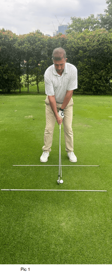 Incorrect ball position is a common fault. When you’re practising, I strongly recommend you get into the habit of putting one alignment stick down just in front of your toes (which you can also point at your target) and another to line up the ball in the centre of your stance. Never feel like you’re past needing to do this – tour players do it all the time.