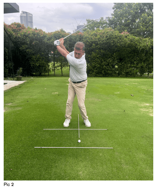 In terms of width of stance, I could draw a straight line from the inside of my feet to the outside of my shoulders. My spine angle is also nice and straight. An arched lower back will affect how you turn.