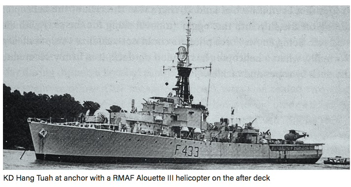 KD Hang Tuah was transferred to RMN, followed by extensive retrofitting and commissioned in Portsmouth on October 2, 1964. It was Malaysia’s first frigate. She arrived in Singapore on December 30, 1964 and was immediately deployed on “anti-confrontation patrol duties” with First Lieutenant Thanabalasingam serving as the Executive Officer (“XO”) with the rank of Lieutenant Commander, second in command to the Commanding Officer, Commander M.J. Mann.