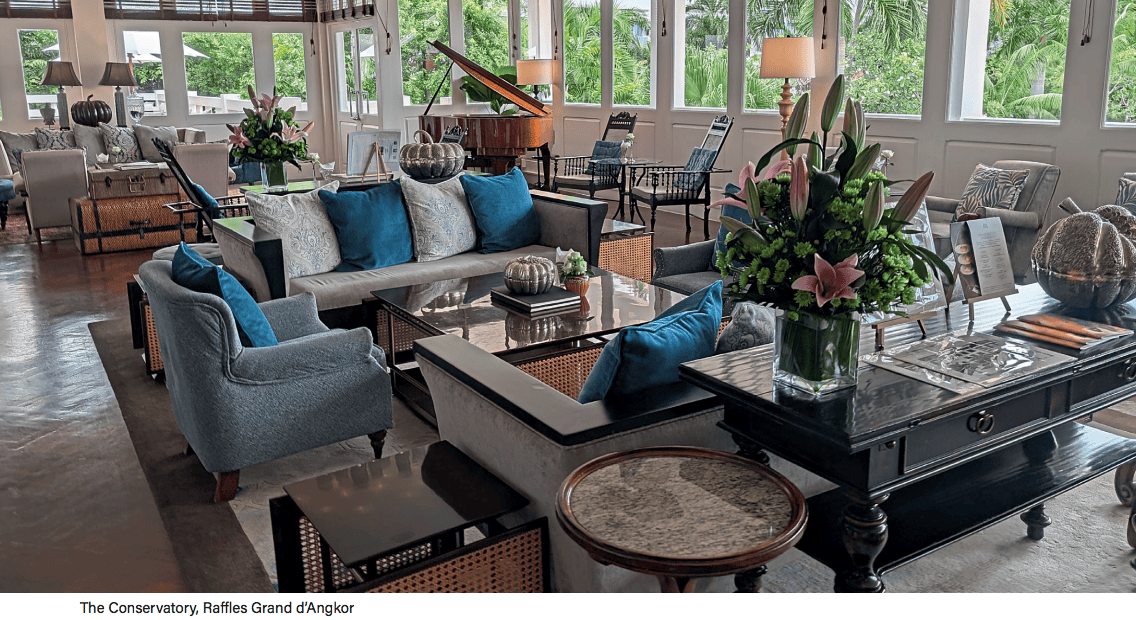 Meanwhile, The Conservatory is a favourite spot for afternoon tea and light bites beneath high French windows overlooking the gardens. At Restaurant 1932, traditional Cambodian dishes are presented with finesse, drawing on timehonoured recipes and seasonal ingredients. Meanwhile, the Poolside Terrace delivers a more relaxed option, with alfresco dining by one of the largest swimming pools in Cambodia. Unsettled weather precluded us from making much use of the pool or the Terrace, but we availed ourselves a leisurely multi-course dinner at 1932, and to say it was terrific would be an understatement. The dishes were executed to perfection, paired nicely with a range of excellent wines, and the service was crisp, friendly, and nicely paced. We’d recommend making a dinner here a special part of any stay at Raffles.