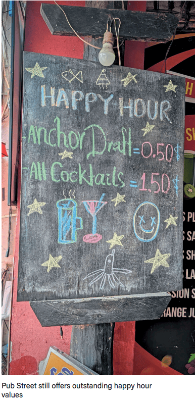 Even in the off season, Pub Street is a hive of activity, but much more so at night. Cold draught beers are available nearly everywhere for 75¢ (about RM3), although some places off the main street still serve up beers at the ‘old’ price of 50¢. Local Khmer cuisine is offered all over the place (be sure to wander down the narrow alleyways between streets), but if you want to sample some very respectable Mexican food, head to Viva Mexican Restaurant – there are two outlets in the Pub Street district. True Tex-Mex aficionados can also seek out Maybe Later Mexican Bar & Grill, just nearby on Street 14. (Try the excellent birria tacos, three for $7,50. www.maybelatertaco. com). For Greek food, check out Elia Greek Kitchen (https:// eliathegreekkitchen.com), which offers tasty Mediterranean fare in a lovely, expansive restaurant with plenty of live plants.