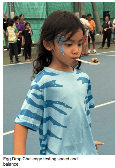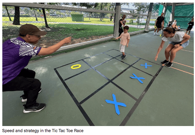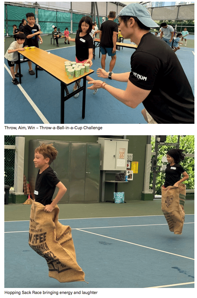 The Covered Court was the centre of activity, where 18 teams of parents and children competed in a variety of sports challenges. Events included Tic Tac Toe, Throwa-Ball-in-a-Cup, Egg Drop, Sponge Fill Water Bottle Sprint, Hopping Sack, and Bean Bag Toss. Laughter, teamwork, and light-hearted competition filled the venue. At the end of the session, the top six teams with the highest points were announced as winners of the day.