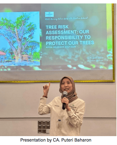 CA. Puteri Baharon, our beloved Certified Arborist, delivered a fantastic presentation and shared her annual Tree Risk Assessment report. She was assisted by her partners, Lar. CA. Fariza Firdaus and CA. Ammar. The presentation highlighted the importance of Tree Risk Assessment, protecting trees while removing hazards that may pose risks to members, staff and facilities. It is a shared responsibility to ensure safety, preserve heritage and maintain the charm and playability of The Royal Selangor Golf Club for generations to come.