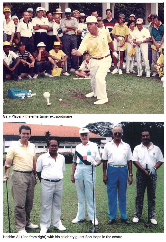 Next up, not another golfing star – but a Hollywood celebrity star! General “Freddy” Hashim Ali had a RSGC CLUBHOUSE CLUB ANNOUNCEMENTS AND NEWS TOURNAMENTS / REPORTS / LADY GOLF NEWS P14-52 delightful start in his rookie year as Club President when he entertained comedian extraordinaire Bob Hope with a game of golf. It was late evening then, and “Freddy” offered Bob the Old Course and the choice of the 1st or 2nd nine. “He wanted to know the difference, and I told him the 1st nine is fairly flat and no water. The 2nd nine is almost similar, but there are two ponds and lots of monkeys. His response was “Let’s play the 1st nine. I do not want the monkeys to recognise me!” So the 1st nine it was, and the monkeys missed out on the opportunity to meet the world’s greatest comedian.”