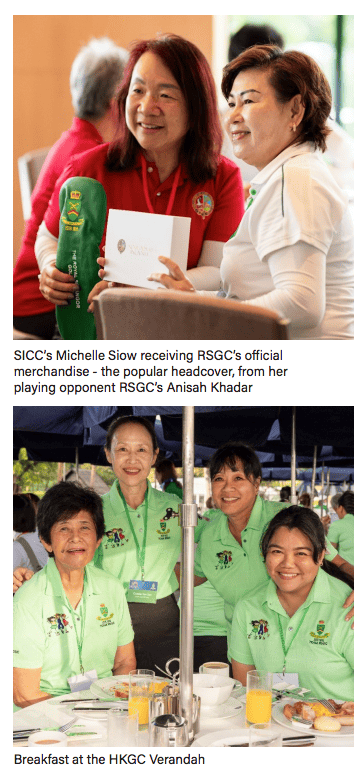The next morning began with heavy rain, but fortunately it stopped about half an hour into play. The ladies were warmly welcomed by HKGC, and that evening’s “80’s Extravaganza” Welcome Dinner was a vibrant night of sparkles, laughter and dancing among the RSGC, HKGC and SICC ladies.