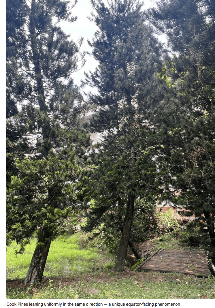 This phenomenon can also be observed in the Cook Pines along the Suleiman Course, where the trees display the same directional lean, as seen in the accompanying photo.