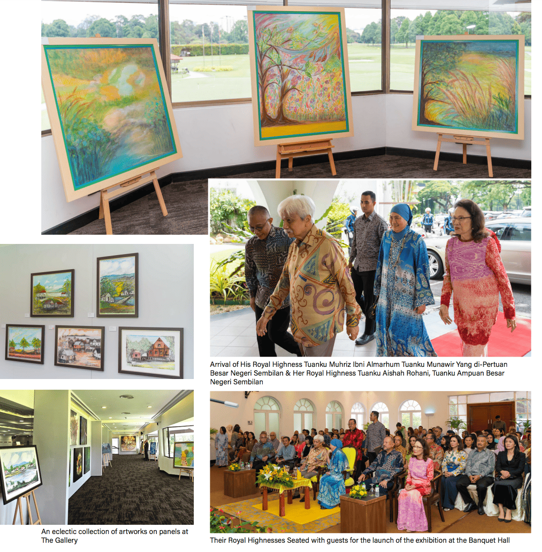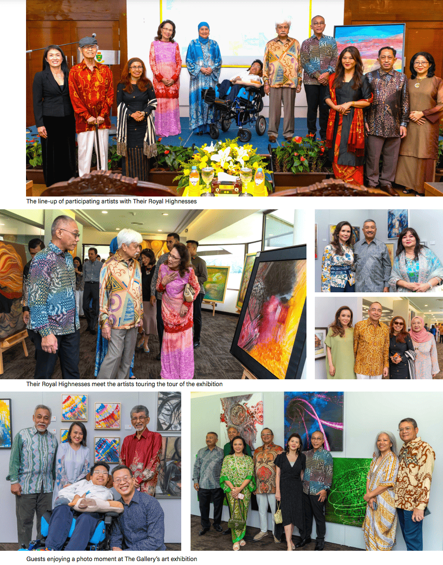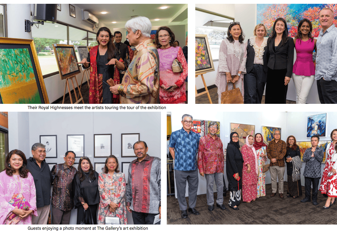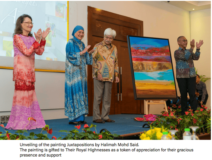 Some 150 guests including notable Club VIPs, Club Members, art collectors and enthusiasts, guests and families of the artists filled up the theatre-style seating to witness the launch proceedings which included the welcome speech, a video presentation of the artists and their artworks, and the unveiling of a painting to mark the official launch. After its unveiling, the painting titled Juxtaposition by Halimah Mohd Said was gifted to Their Royal Highnesses as a token of the artists’ appreciation for Their Royal Highnesses’ gracious presence and support.