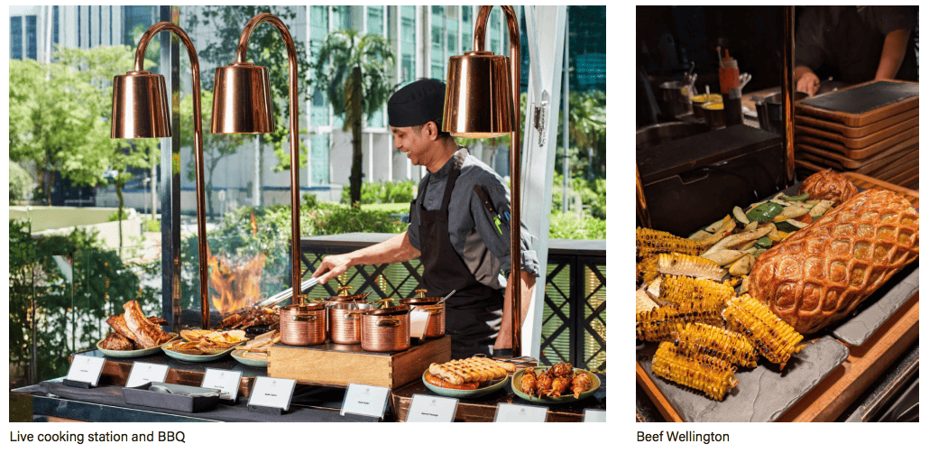An outdoor BBQ live cooking station adds tiger prawns, scallops, baby lamb racks, and Spanish sausages, all matched with a tidy list of sauces. It’s a seriously impressive spread, and we appreciated that the hybrid format, paired with smallersized selections on the buffet portion (replenished, of course) helps to mitigate the food waste issue that always accompanies any such feast.