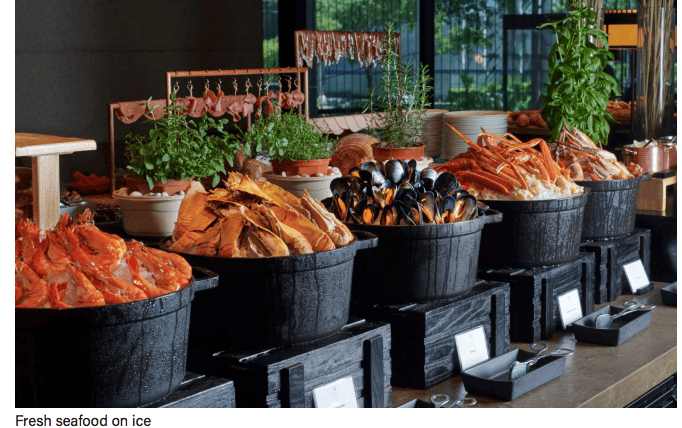 Seafood lovers will appreciate the lovely spread featuring tiger prawns, slipper lobster, mussels, sea clams, and Alaskan queen crab. Warm dishes, presented on a counter right by the open kitchen, rotate through comfort favourites, including crab and lobster chowder, beef lasagna, poached mussels with garlic butter, and skillet vegetables. The Mibrasa makes another appearance in the Asian-marinated whole barramundi and a well-made beef Wellington served with Yorkshire pudding, mash, sautéed spinach, and au jus.
